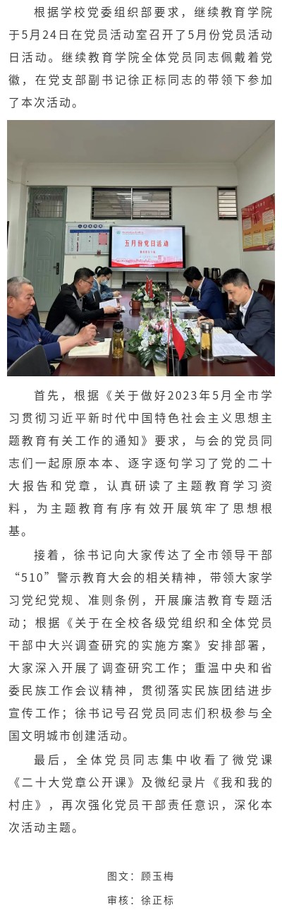 牢筑思想根基 加固廉洁防线 ——继续教育学院召开5月份党员活动日活动