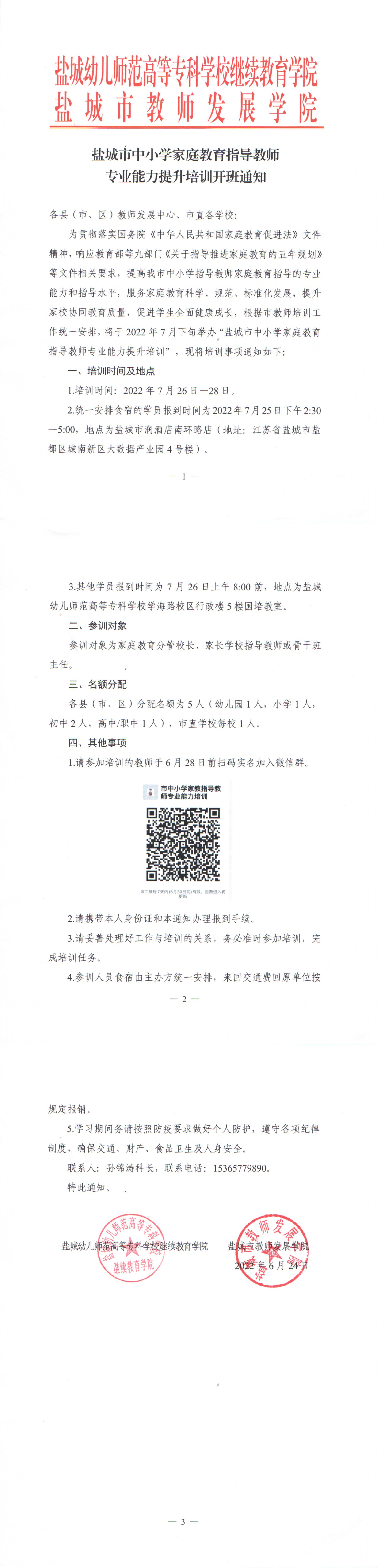 盐城市中小学家庭教育指导教师专业能力提升培训开班通知