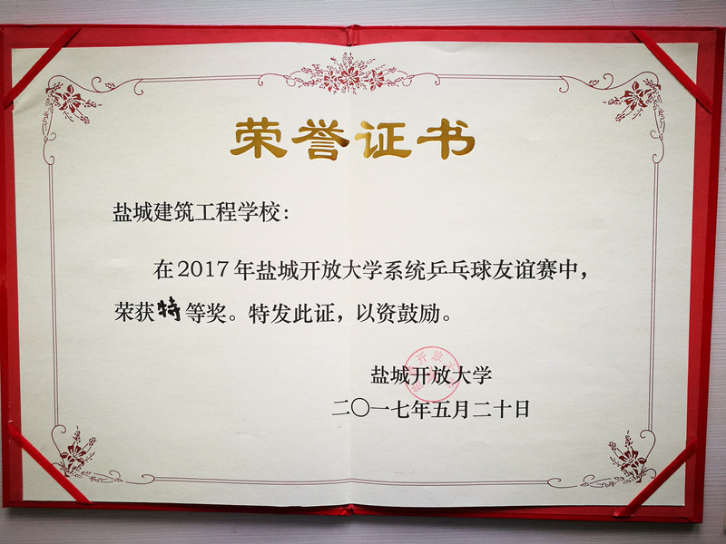 2017年盐城开放大学系统乒乓球友谊赛5月20日上午在建湖开放大学隆重开幕。本次友谊赛共有12支代表队参赛,各开大的主要校领导和开放教育负责人参加本次友谊赛。经过激烈的争夺,我院(盐城建校)代表队获得比赛第一名赢得了冠军杯,比赛结束后举行了隆重的颁奖仪式。