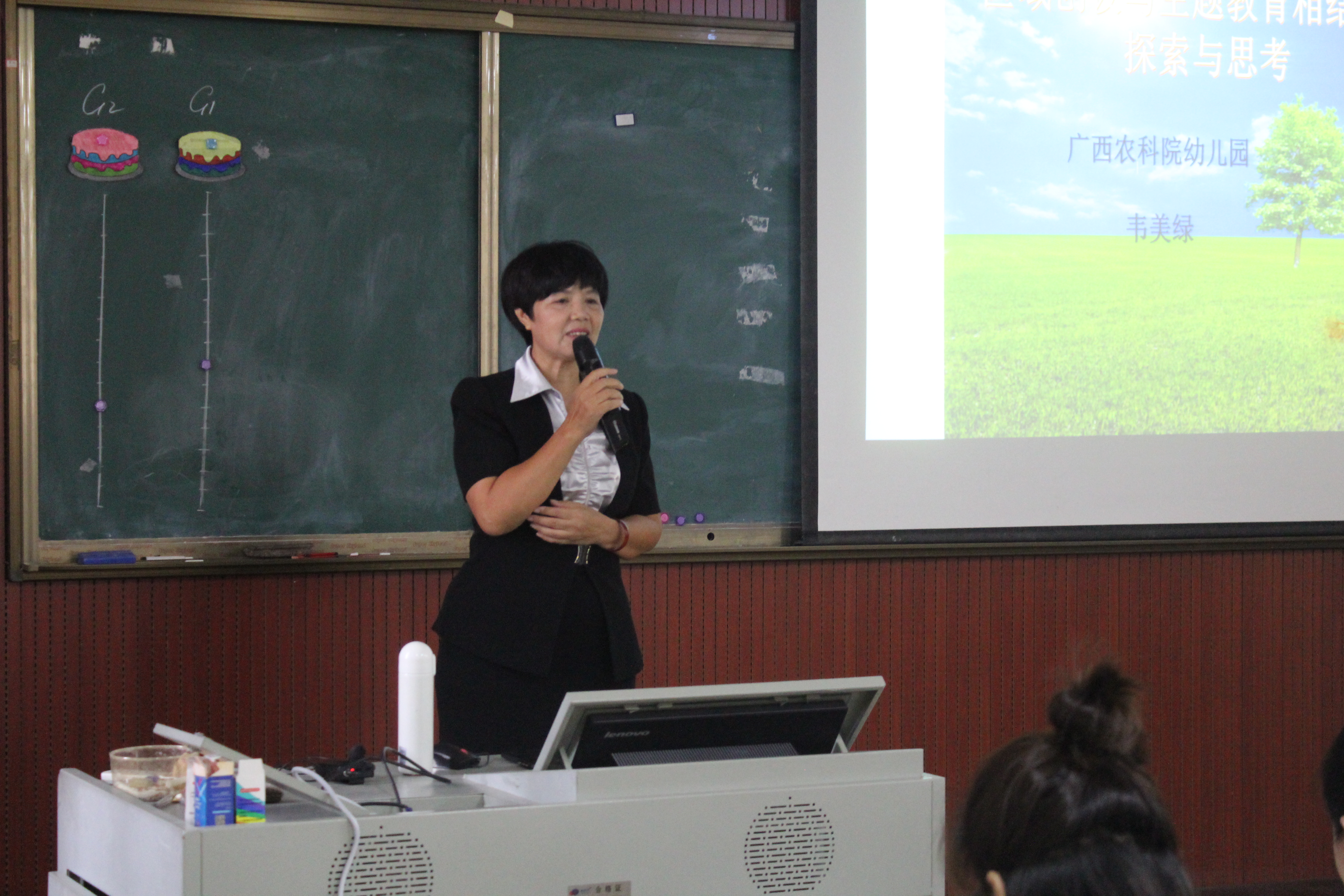 韦美绿:中共党员,小学中的中学高级教师(副教授级),大学本科学历;广西特级教师,现任广西农科院幼儿园园长,是中国学前教育学会和广西学前教育学会会员,广西壮族自治区区、市级示范幼儿园评估专家。从事幼教工作39年,具有丰富的教育教学经验和管理经验,曾获得自治区先进教育工作者等荣誉称号。在“九.五”规划到“十三.五”规划期间,先后主持、指导和参与国家、自治区、市级共10项课题的研究,2018年获批成立南宁市特级教师韦美绿工作室。研究成果曾获得国家级部门专项研究成果论文一等奖,自治区、市级成果论文评比一、二等奖6项,曾受邀在全国幼教高峰论坛会议上做主题发言。