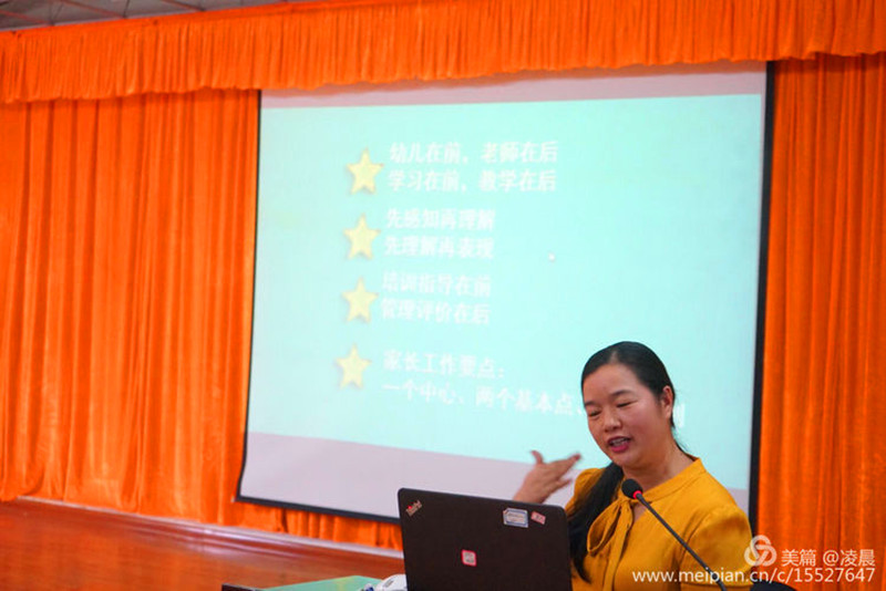 接着,莫芳副园长给学员们开设了《心里健康教育与家园合作的有效策略》的讲座,她结合体育节亲子运动会、欢乐水世界、欢乐美食汇、三月三民俗活动、家长进课程活动等案例,给大家讲析了怎样开展心理健康活动,如何调动家长参与的积极性,促进家园共建的有效策略。她认为,解决家园问题要从四点出发,一是直面问题,积极引导;二是服务在前,要求在后;三是优势互补,真诚互动;四是激情参与,促进成长。莫芳园长的讲座集趣味性、知识性、生活性、理论性、指导性于一体,受到学员的一致好评。