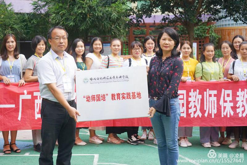 为了发挥自治区示范园示范辐射作用,促进资源共享,携手推进幼教事业的发展,盐城幼专与横州镇幼儿园建立了友好合作关系。在培训现场,学员们见证了双方的签约挂牌仪式。吴世梅园长和王礼才院长分别代表双方学校完成了此项议程。