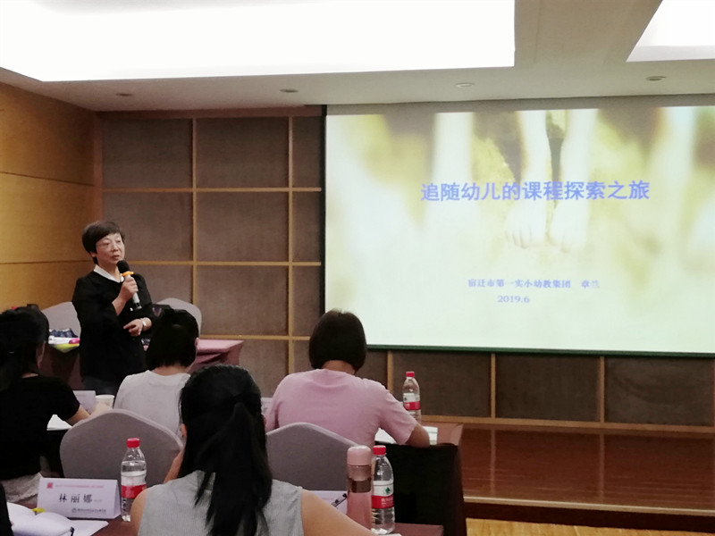 章兰园长首先介绍了宿迁市第一实小幼教集团的基本情况,回顾了游戏化实施中的基本路径三部曲:在环境的重新规划、调整中-------更新理念,重塑儿童观、课程观,初步构建课程框架;“放手”中逐步重新认识儿童、发现儿童潜能;我们和孩子们一起成长。章兰园长用一个个鲜活的案例,将《指南》、《实施意见》、五大领域教学等有机融入,给学员们展示了别开生面的一课。