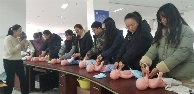 培训现场,同学们按照老师们教授的要领,将手部消毒、抱放婴儿、脐部护理、婴儿抚触、母乳喂养、大动作训练、测量、设计婴儿认知能力的活动等项目一一训练,边做边解说,与婴儿模型进行亲切互动,他们动作协调,语调温柔,将“爸爸”、“妈妈”的角色扮演得可圈可点。培训时,时而榜样示范,时而统一行动,时而互动点评,真正体现了学会学习、学会分享、学会合作。