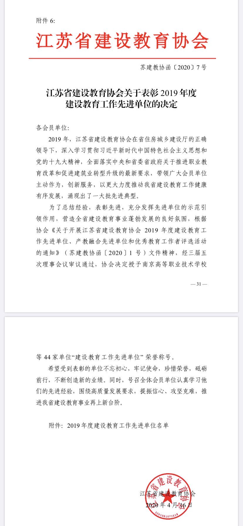 日前,从刚刚召开结束的江苏省建设教育协会三届五次理事会议传来喜讯,我校被省建设教育协会表彰为2019年度建设教育工作先进单位。2019年,我校建设类安全员培训8944人;组织无纸化考试183场次,参考 8113人,培训、考试工作得到市住建部门充分肯定。值此新学期学生返校之际,特向全校师生报喜,成绩离不开学校党政的正确领导,荣誉凝聚全体同仁的广泛支持,我们将以此作为新的起点,再接再厉,为学校服务地方经济高质量发展再创新佳绩!