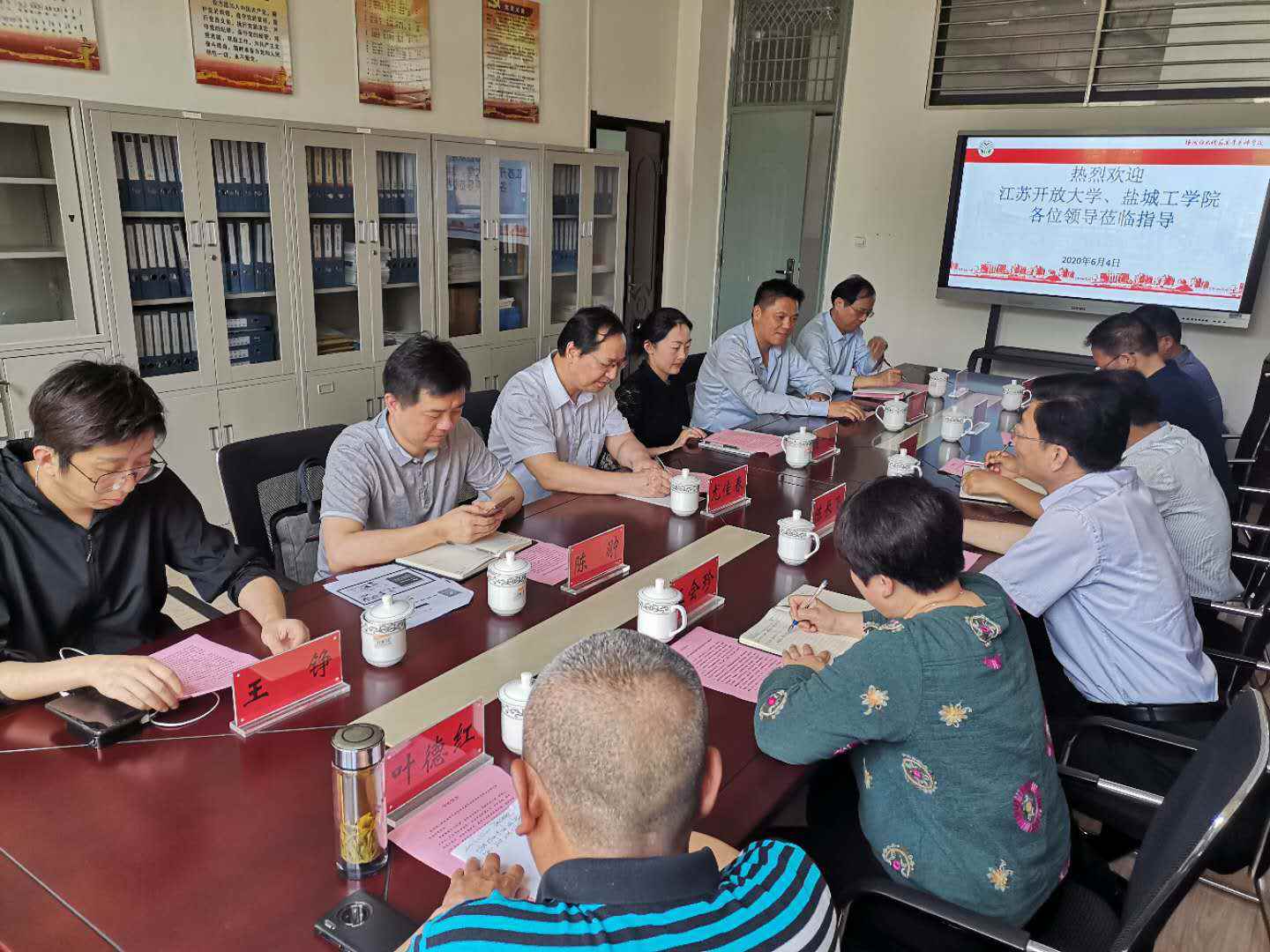 2020年6月4日上午,江苏开放大学尤佳春校长一行4人、盐城工学院继续教育学院高健书记和周学高院长莅临我校,就开放大学办学情况进行了考察交流。陈长飞副校长热情接待了到访的领导。