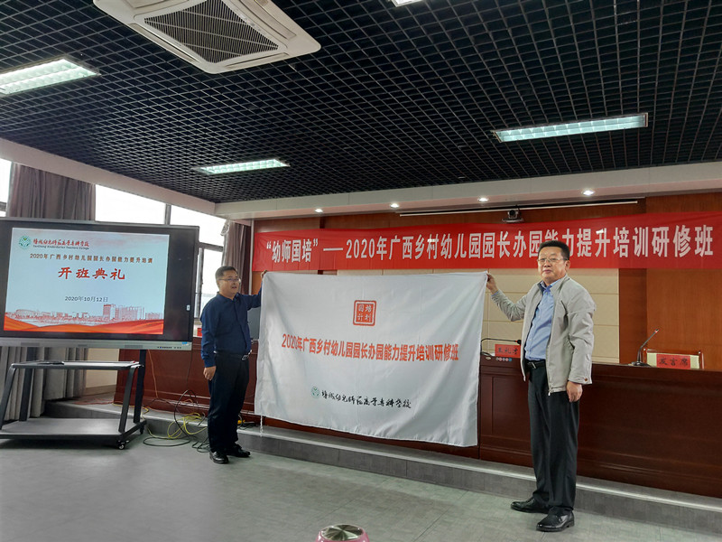 2020年10月12日上午,在我校学海路校区行政楼5楼国培教室,来自广西的83位学员参加了2020年广西乡村幼儿园园长办园能力提升培训班开班仪式。出席开班仪式的有盐城幼专姜统华校长、继续教育学院王礼才院长、王会珍副院长、国培科孙锦涛科长。开班仪式由王会珍副院长主持。
