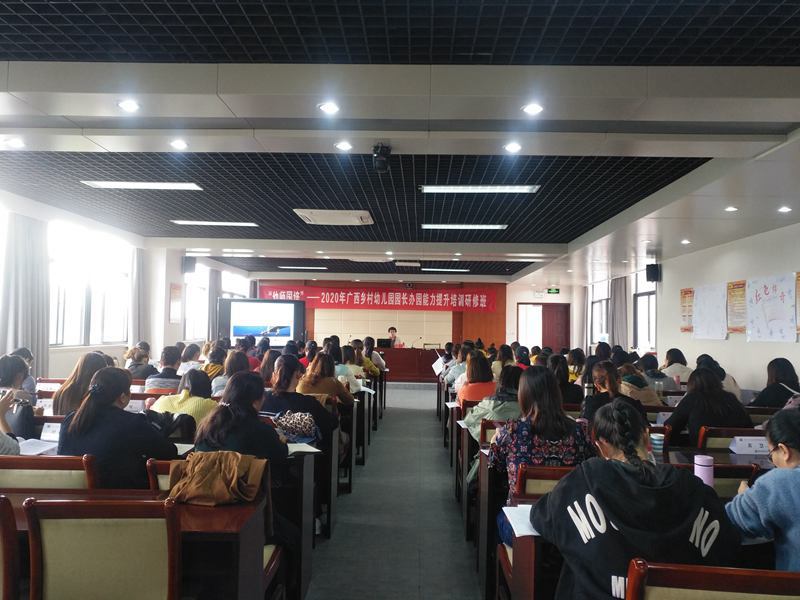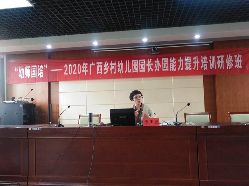 2020年10月13日下午,我校邀请扬州大学学前教育学院副院长、副教授曹玉兰为广西国培班的园长们开设了《培根铸魂,立德树人——做新时代学前教育的“引路人”》的讲座。讲座在5楼国培教室进行,83位学员全部聆听了讲座。
