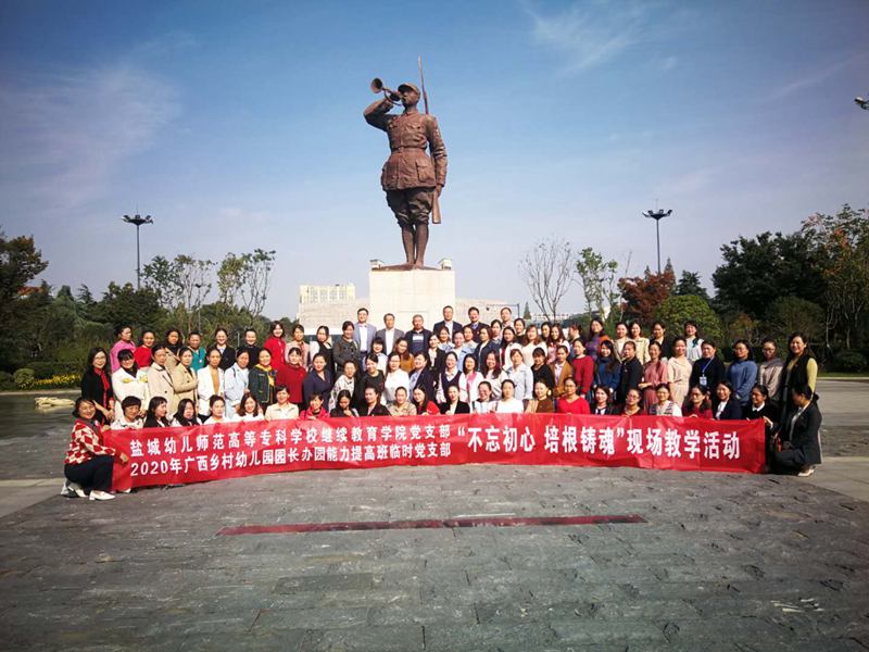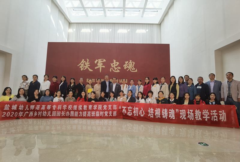 2020年10月20日上午,继市幼儿园李霞老师的《基于公共服务大数据平台的3~6岁儿童学习与发展记录跟踪研究及应用》学习大礼包后,国培班学员再次收获了一份礼包,那就是国培班临时党支部与继续教育学院党支部到盐城新四军纪念馆联合开展了“不忘初心 培根铸魂”现场教学活动。