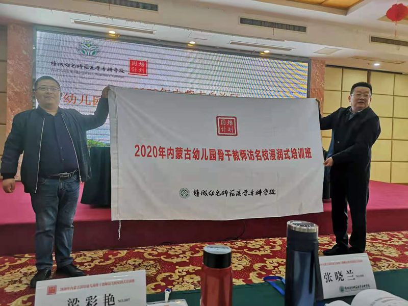 姜统华校长为继续教育学院培训科科长、本次培训班总班主任孙锦涛授了班旗。