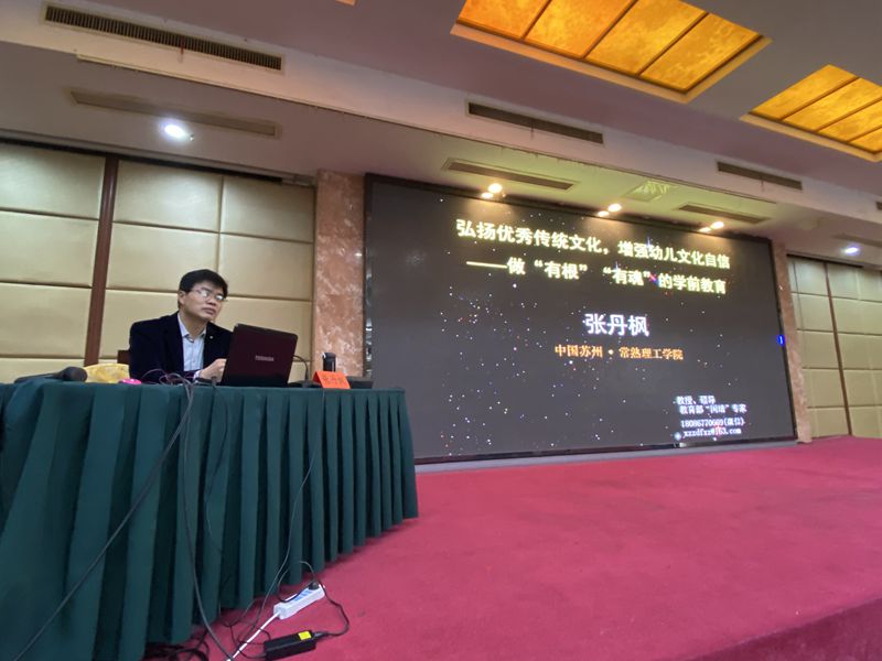 张丹枫教授围绕“背景”、“要义”、“策略”三部分来讲授。在“背景”部分,张教授从十九大明确强调、《指南》明确要求、学前教育事业发展成就、存在问题、现实问题等五个方面来分析弘扬优秀传统文化、增强幼儿文化自信的必要性。“要义”部分,他先给大家定义了文化与文化自信,分析了文化自信的三个来源、四个特质、坚定文化自信的四个问题,指出学前教育要弘扬优秀文化、增强文化自信。“策略”部分,张教授以案例来解析,为老师们详细讲解了可以采取的落地举措。最后,张教授以“晴空一鹤排云上,便引诗情到碧霄”结束了讲座。