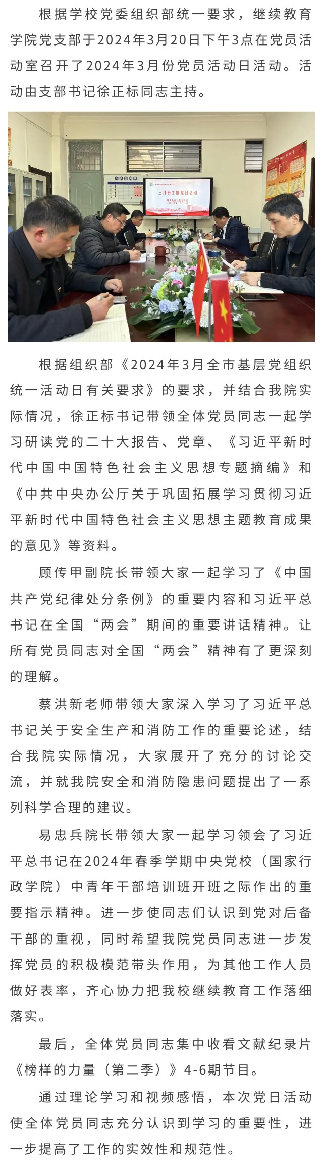 强化思想武装 提升工作效能 ——继续教育学院党支部召开2024年3月份党员活动日活动