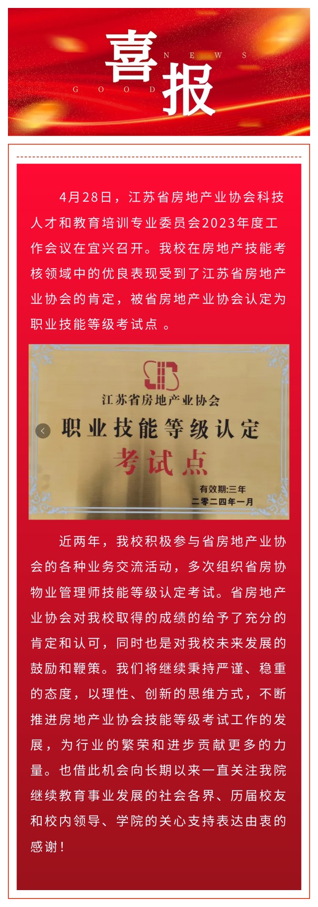 喜报:我校被江苏省房地产业协会认定为职业技能等级考试点