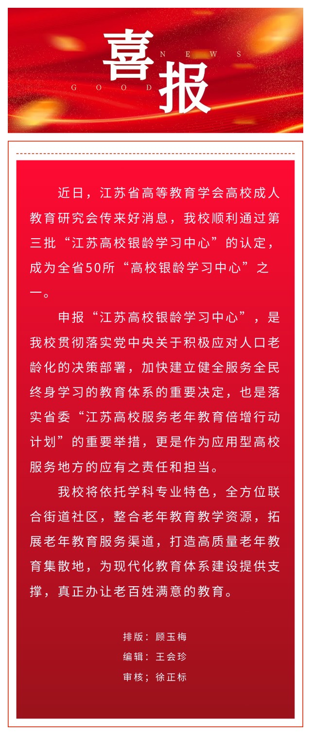 喜报:我校顺利通过第三批“江苏高校银龄学习中心”的认定
