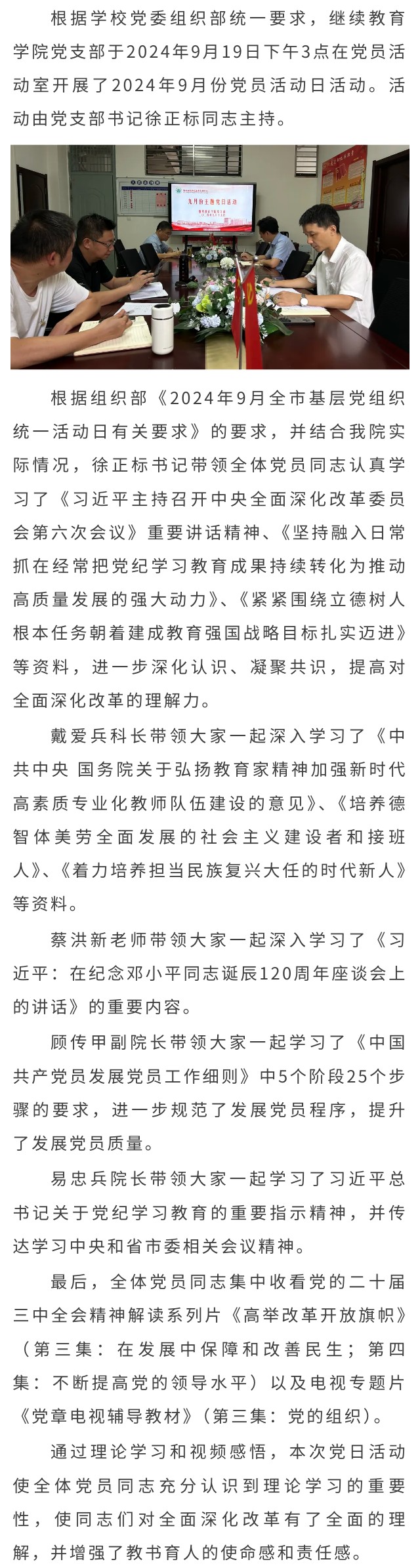 弘扬教育家精神 提升教书育人能力 ——继续教育学院党支部开展2024年9月份党员活动日活动