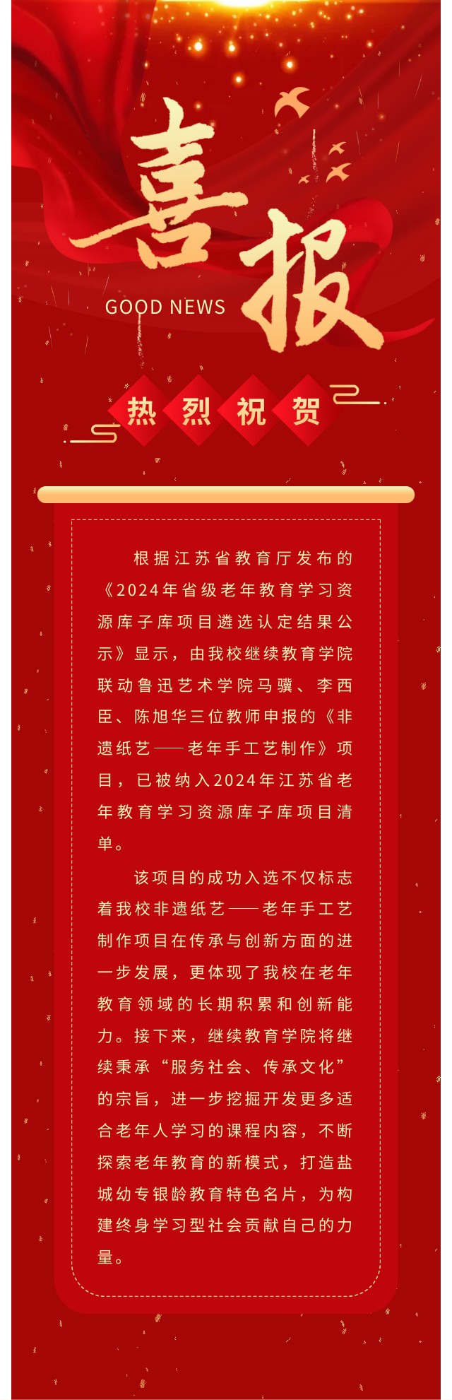 喜报:热烈祝贺我校申报的非遗纸艺——老年手工艺制作项目成功纳入2024年江苏省老年教育学习资源库子库项目清单