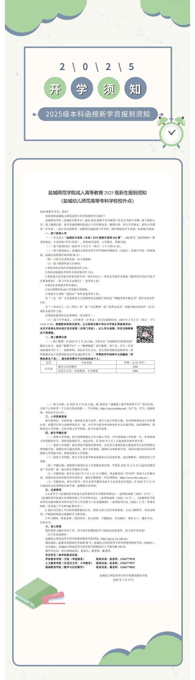 盐城师范学院成人高等教育2025级新生报到须知 (盐城幼儿师范高等专科学校校外点)