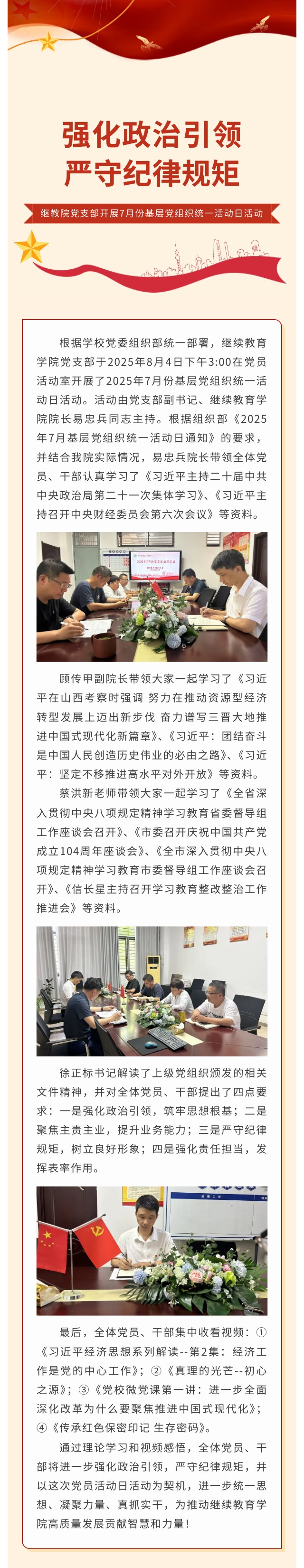 强化政治引领 严守纪律规矩——继续教育学院党支部开展2025年7月份基层党组织统一活动日活动