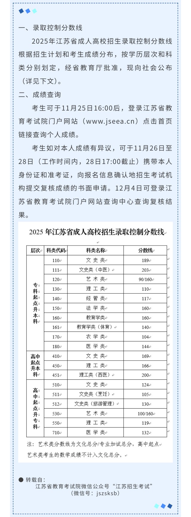 2025年江苏省成人高校招生录取控制分数线公布和成绩查询通告