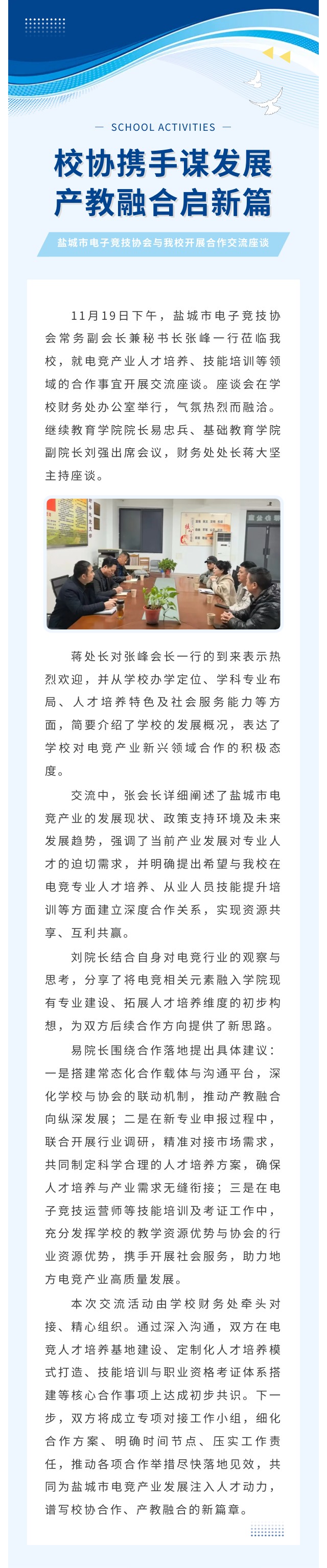 校协携手谋发展 产教融合启新篇 ——盐城市电子竞技协会与我校开展合作交流座谈